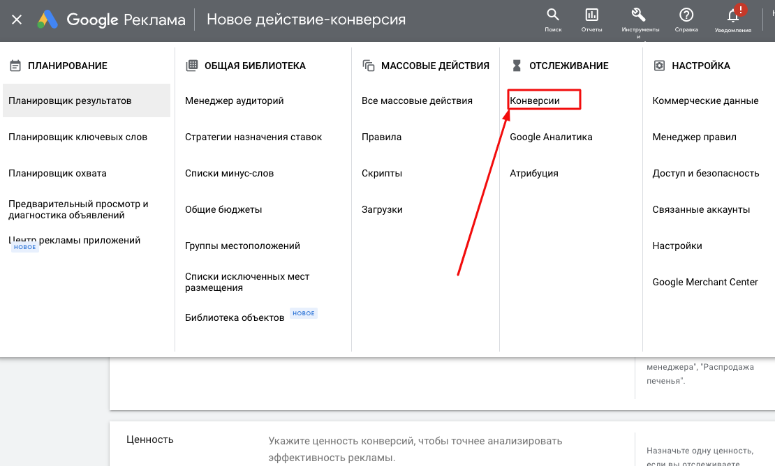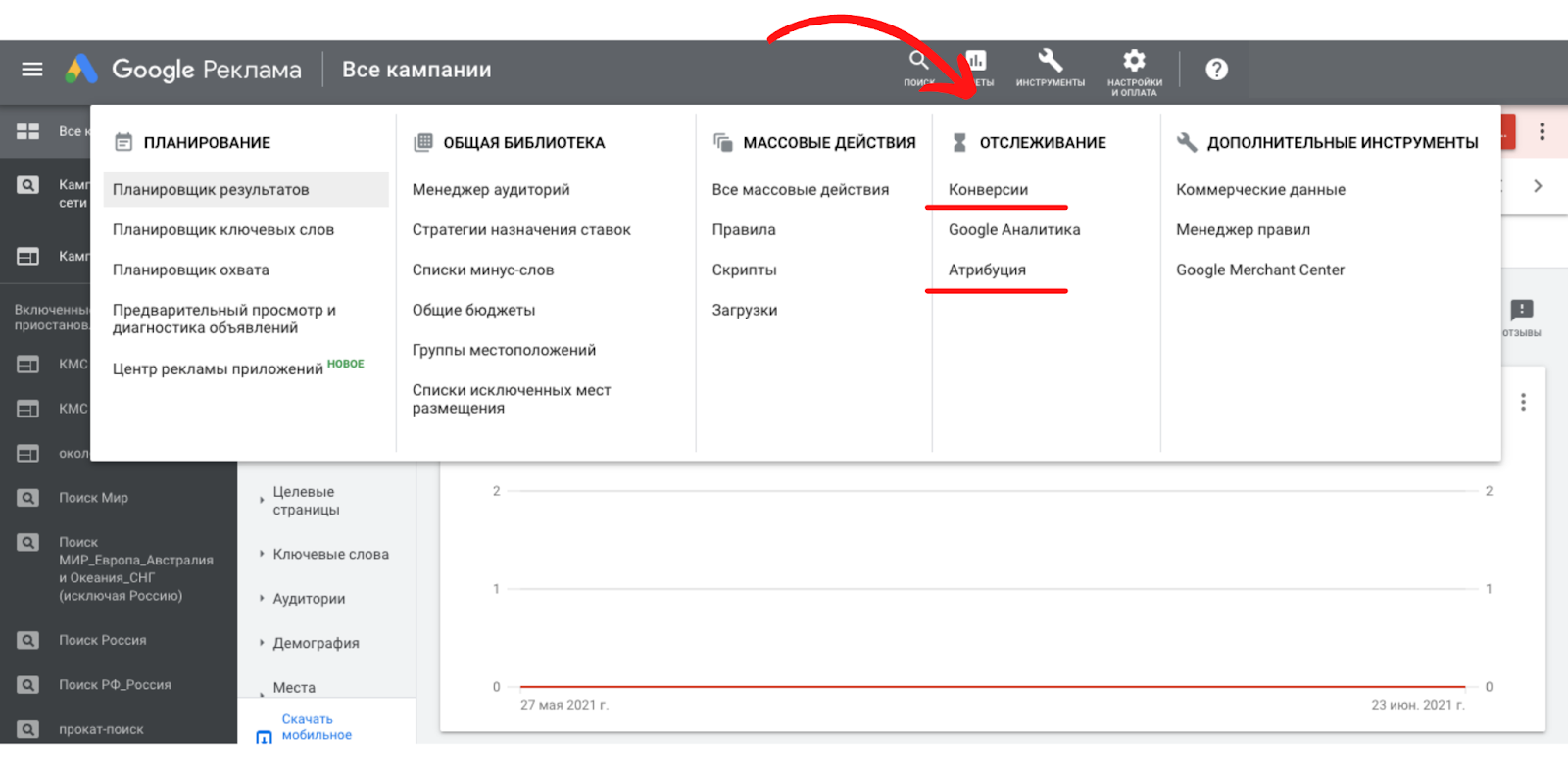 Чтобы ознакомиться с доступными моделями атрибуции в Google Ads, перейдите в раздел «Инструменты». Затем нажмите на пункт «Отслеживание» и выберите пункт «Атрибуция».