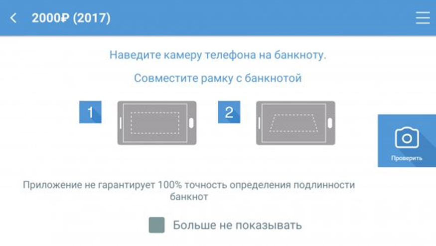 - Установите камеру на купюру, совместив ее по рамке с деньгами. Когда рамка точно совпадет с изображением, то углы станут зелеными.