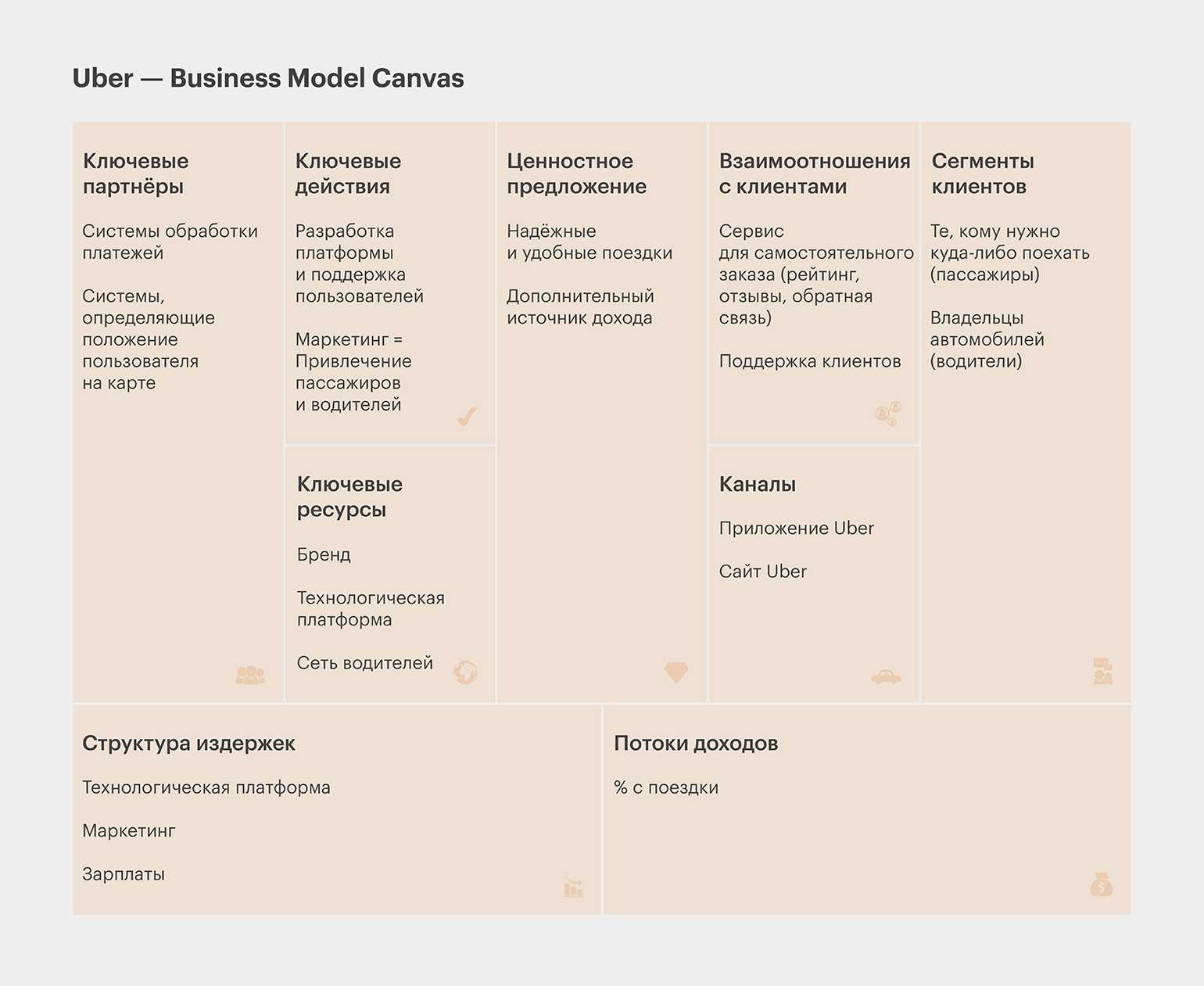 В этом разделе мы разберём два примера. Сначала мы посмотрим на шаблон Остервальдера, заполненный для реальной компании, — Uber. Пример взят из нашего гайда по Business Model Canvas.