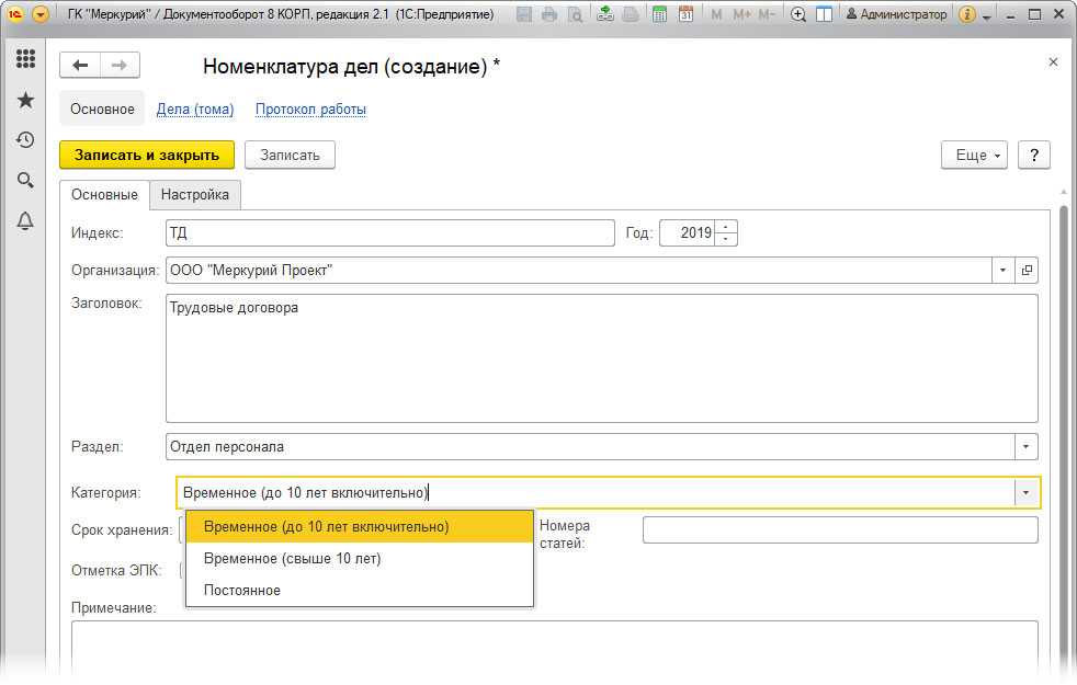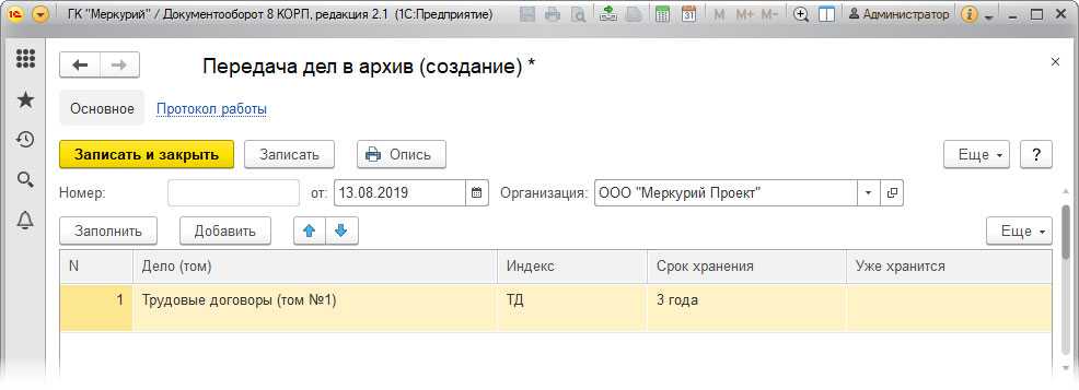 - срок хранения дела (который может соответствовать требованиям закона или внутренним правилам организации),