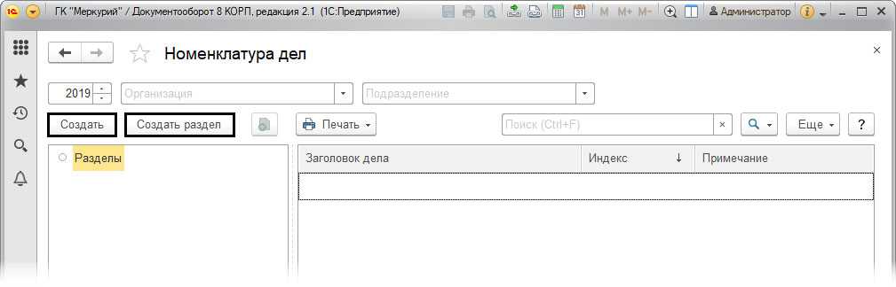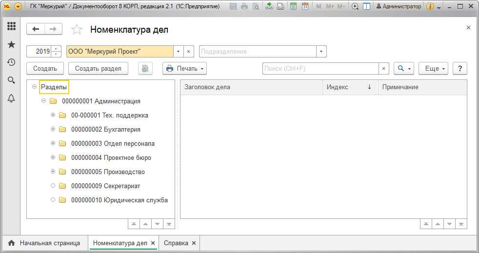 Будет показана существующая структура фирмы и по нажатию «Создать разделы» помеченные подразделения скопируются в «Номенклатуру дел» в качестве разделов.