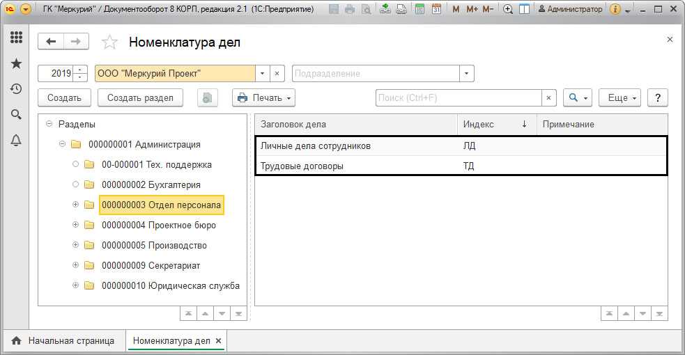 Скажем, в разделе «Секретарь» уместно разместить «Приказы», «Деловую переписку» и т. п., в «Отделе кадров» — «Договора с сотрудниками», «Личные дела», «Поручения», в «Юридической службе» — дела по отдельным документам и договорам.