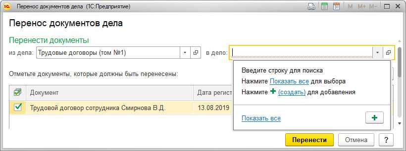 Всё, что требуется — отметить, в какое из дел переносить документ.