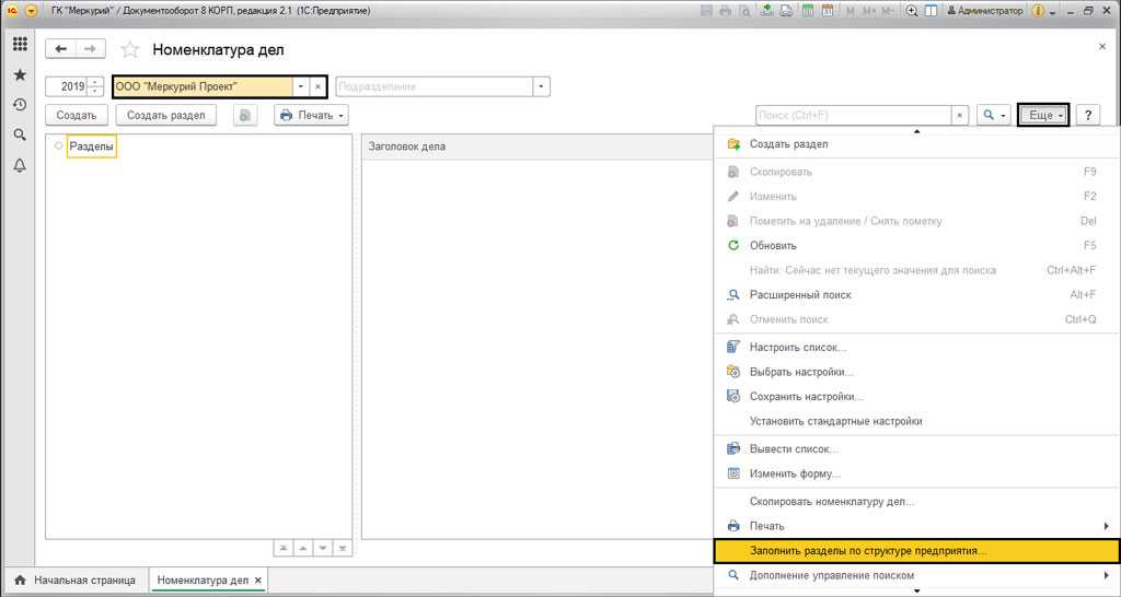 Через программу «1С:Документооборот» соответственно структуре организации возможно автоматическое заполнение разделов. Чтобы его выполнить, указав организацию и нажав на «Ещё», следует перейти к команде «Заполнение разделов по структуре компании».