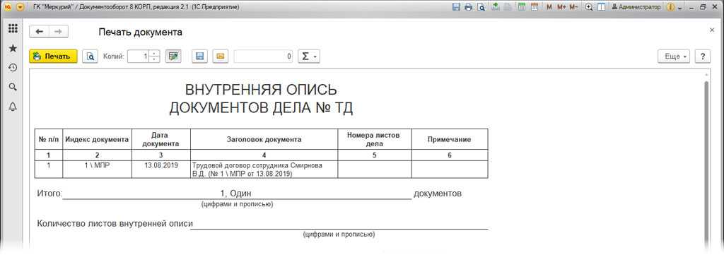 В томе (деле) иногда бывает много документов, но каждый документ может быть в составе лишь одного дела. Из справочника номенклатуры, открыв конкретный том, можно просмотреть состав, а, нажав «Печать», распечатать документы из различных разделов, например: «Карта-заместитель», «Внутренняя опись», «Обложка дела» и «Лист-заверитель».