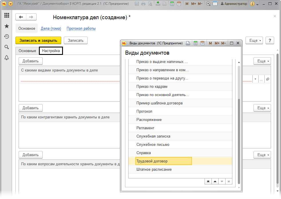 В «Настройках» можно отметить, какие виды документов, по каким вариантам деятельности или контрагентам хранятся в деле.