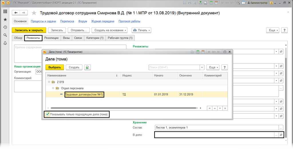 Для помещения документа в дело (том) при создании надлежит заполнить поле «Дело» снизу документа в закладке «Реквизиты». В открывшемся окне указывается том, куда следует поместить документ. Программа автоматически подсказывает его. Если снять галочку «только подходящие», выведутся все текущие тома.