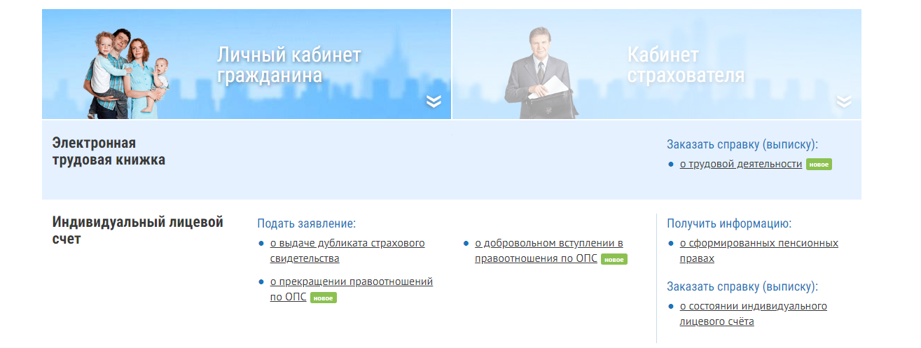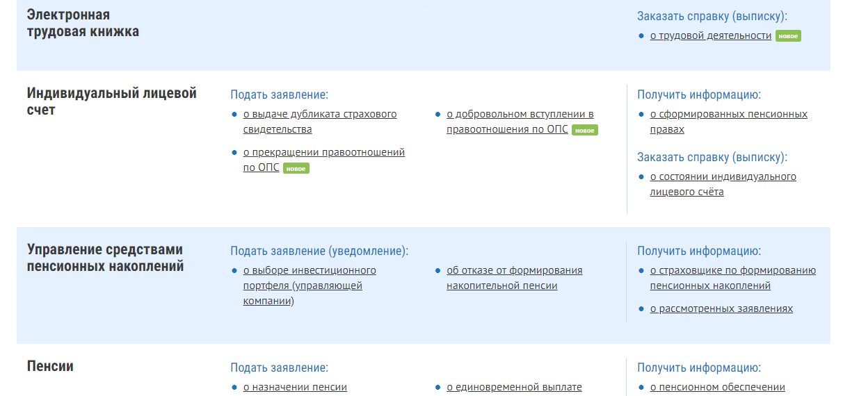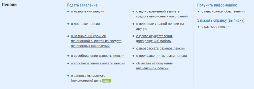 После перехода в сервис, клиент может сделать запрос на оформление документов, получение пенсии и других страховых выплат, а также узнать о накоплениях.