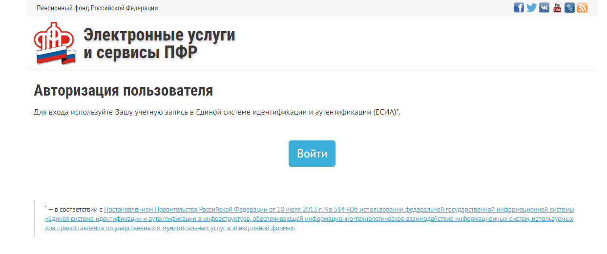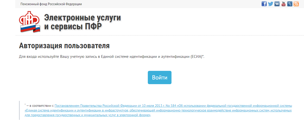- Появится окно сайта Госуслуг. Нужно нажать кнопку «войти». Программа автоматически перенаправит пользователя в личный кабинет ПФР