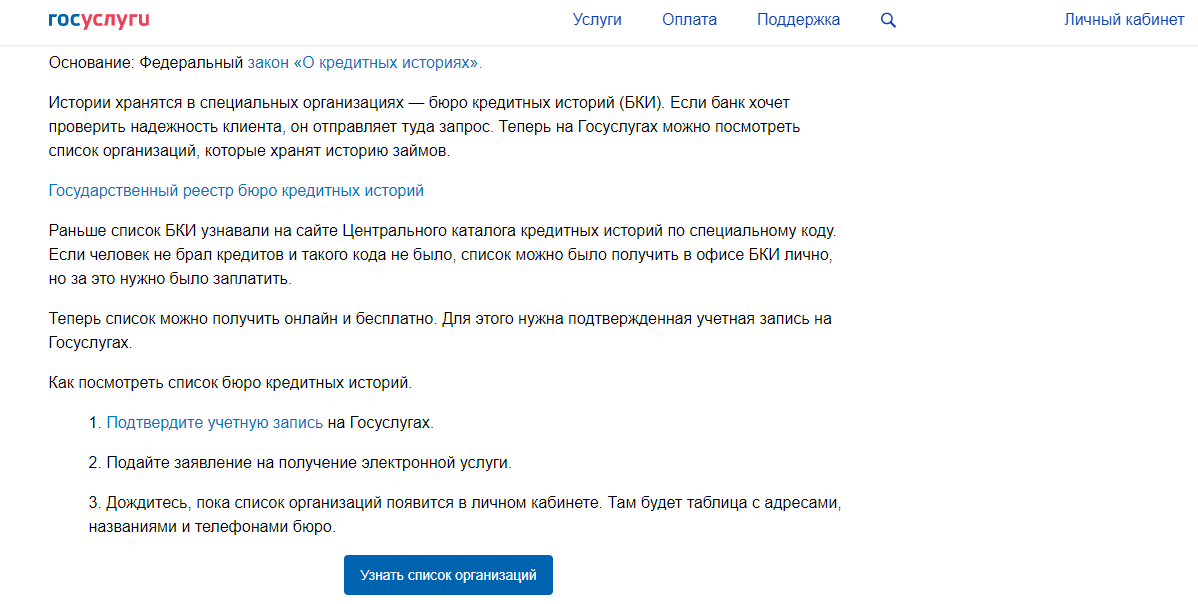 Если кредитная история имеется, и у вас есть основания полагать, что она подпорчена, для начала нужно понять, насколько велики ваши шансы. Запросить кредитную историю и кредитный рейтинг можно бесплатно дважды в течение календарного года. Сделать это проще всего с помощью портала Госуслуги, где можно выбрать кредитное бюро из предложенного списка.