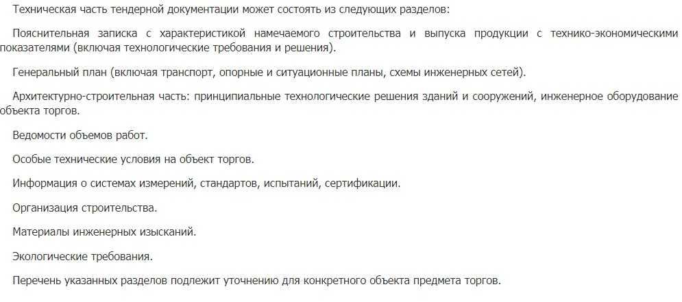 Документация для участия в тендере вмещает этот раздел по необходимости. Содержание его положений можно рассмотреть на примере тендера на подрядные работы по возведению сооружений «под ключ»: