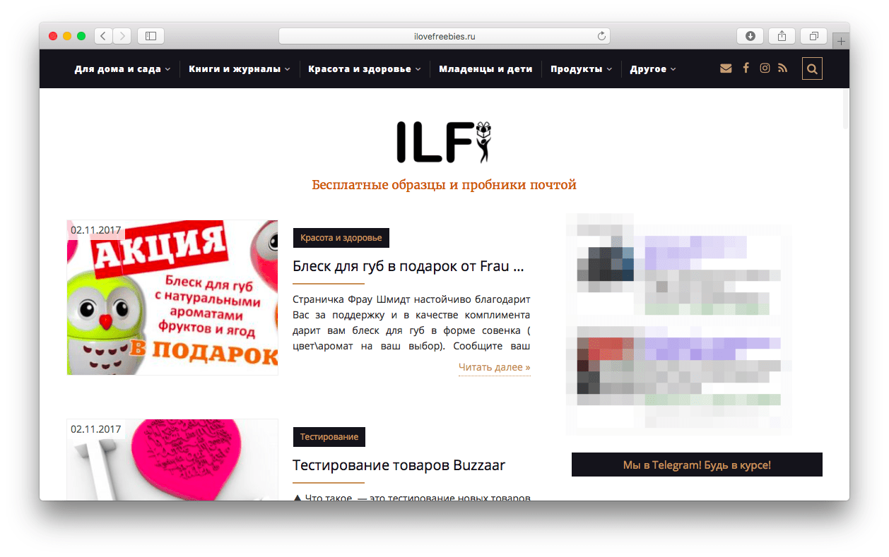Как и на других порталах, здесь публикуются объявления о тестерах и пробниках, которые можно получить по почте. Главный плюс сайта — удобный дизайн и каталог, с помощью которого поиск нужного подарка становится гораздо проще. Например, если вы хотите заказать духи или косметику, просто кликните на раздел «Красота и здоровье» — теперь можно наслаждаться изобилием предложений! Кстати, агрегатор собирает акции не только из Рунета, но и иностранных сайтов, поэтому выбор халявы воистину велик.