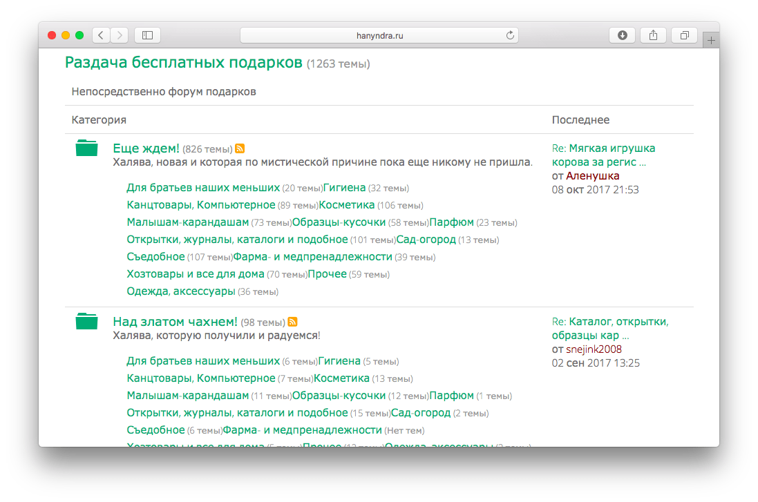 На форуме несколько основных разделов: «Одежда», «Эх, подарю» (конкурсы устраивают сами форумчане), «Образцы и пробники», «Диски». Как и на многих других сайтах, на «Халяве» надо завести аккаунт: иначе вы рискуете пропустить самые горячие предложения.