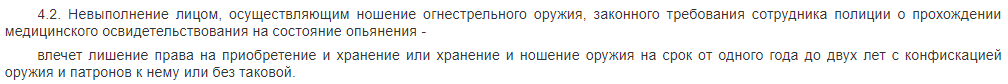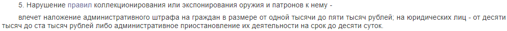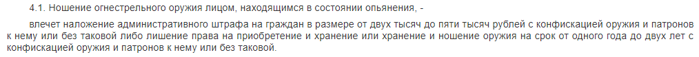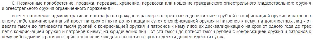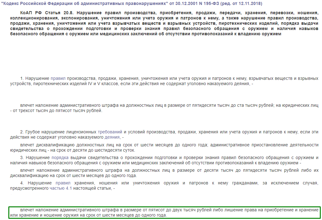 Согласно статье 20.8 кодекса об административных правонарушениях Российской Федерации за нарушение правил хранения, ношения или уничтожения оружия и патронов к нему влечет наложение административного штрафа в размере от пятисот до двух тысяч рублей, либо лишение права на приобретение и хранение или хранение и ношение оружия на срок от шести месяцев до одного года.