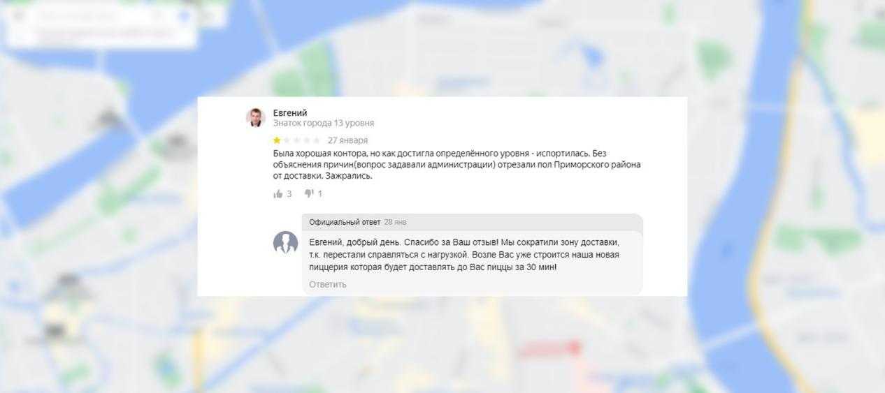 Помните, что даже в самой критической ситуации вы обязаны оставаться вежливыми со своими клиентами. Поэтому постарайтесь не реагировать на оскорбления: негативный отзыв – это инструмент, с помощью которого вы можете выявить проблему. На примере ниже проблема уже решилась – новая пиццерия в стадии постройки, и представитель компании говорит клиенту об этом. Вежливым и официальным тоном!