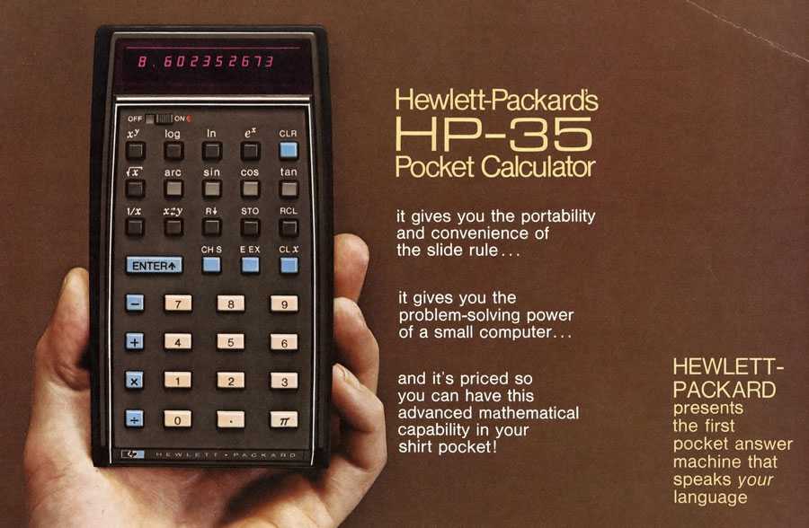 В 1973-м вышел HP-35 – «научный» калькулятор от Hewlett-Packard: почти карманный, умеющий вычислять тригонометрические и алгебраические функции и стоивший 395 долларов.