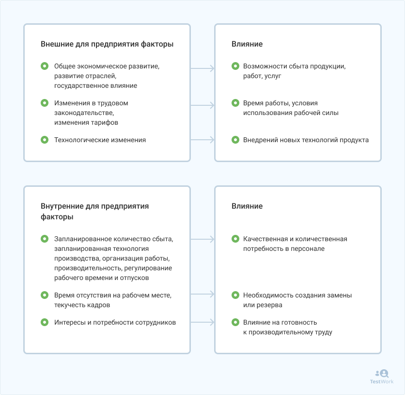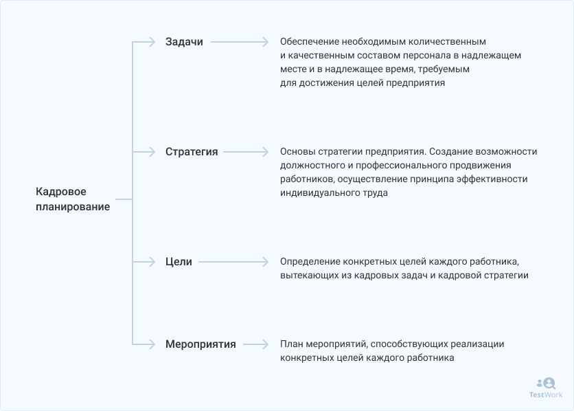 - Разработка действий по привлечению, обучению, перемещению работников и доведению фактической численности в будущем до необходимой предприятию величины.