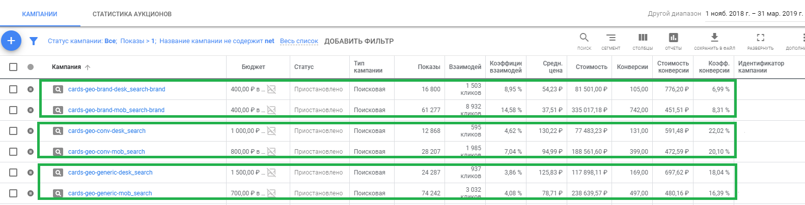 В рамках теста мы создали отдельные поисковые кампании на мобильные устройства и десктопы для всех тактик: брендовой, конверсионной и общей. Настроили идентичные таргетинги, добавили одинаковые объявления и сделали соответствующие корректировки по типу устройств, исключив показы на мобильных в кампаниях с таргетингом на десктопы и наоборот.