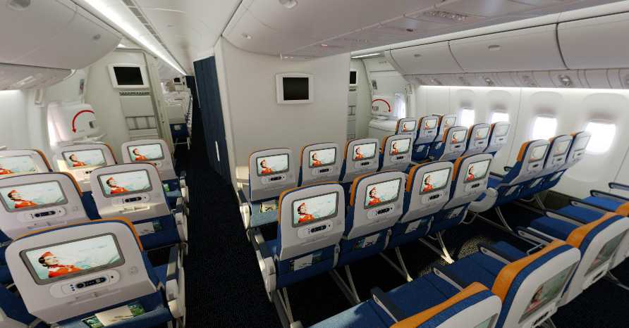 У Боинга 777-300 трех классовая компоновка салона: бизнес, комфорт и эконом-класс.