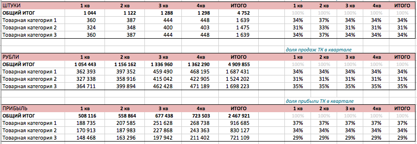 Анализ выполнения плана продаж мы проводим по трем показателям: отгрузки в натуральном выражении, выручка и прибыль. В каждой таблице мы рассчитываем % выполнения плана и динамику по отношению к прошлому году. Все планы разбиты по товарным категориям, что позволяет более детально понимать источники недопродаж и перевыполнения плана. Анализ проводится на ежемесячной и ежеквартальной основе.
