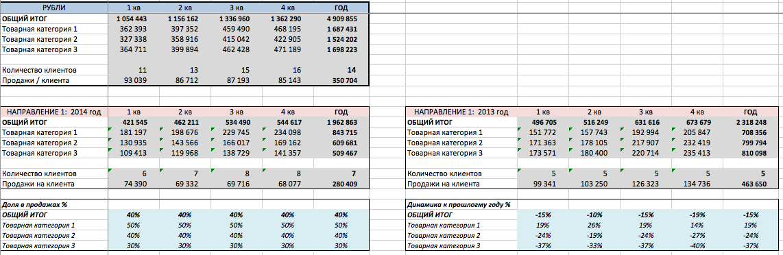 Далее мы собираем статистику отгрузок по основным направлениям отдела сбыта. Общую выручку (в рублях) мы разбиваем по направлениям сбыта и по основным товарным категориям. Статистика необходима только в рублевом значении, так как помогает контролировать общую ситуацию в продажах. Более детальный анализ необходим только в том случае, если в одном из направлений отмечается резкое изменение динамики продаж.