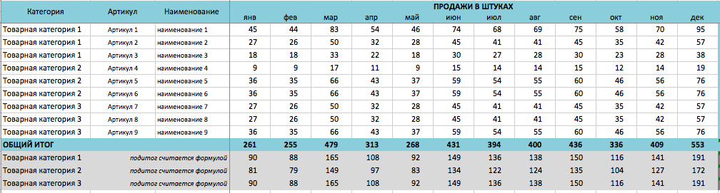 Представленную выше таблицу мы заполняем по следующим показателям: штуки, рубли, средняя цена продажи, себестоимость, прибыль и рентабельность. Данные таблицы будут являться первоисточником для будущего анализа продаж.
