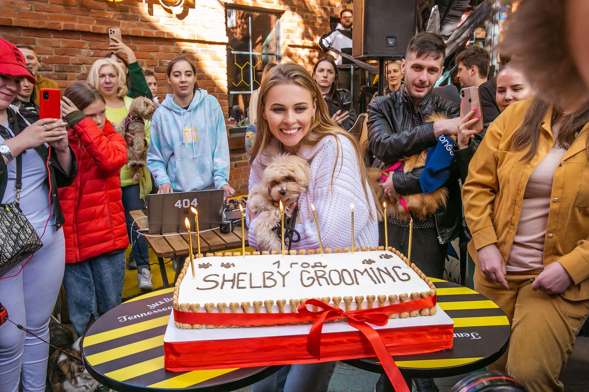 В день рождения салона 29 мая мы организовали вечеринку с креативным временным окрашиванием шерсти питомцев, тортом для собак, диджеем и розыгрышем призов от наших партнёров — производителей кормов и аксессуаров для питомцев. В руках у меня Шелби — моя собака породы мальтипу