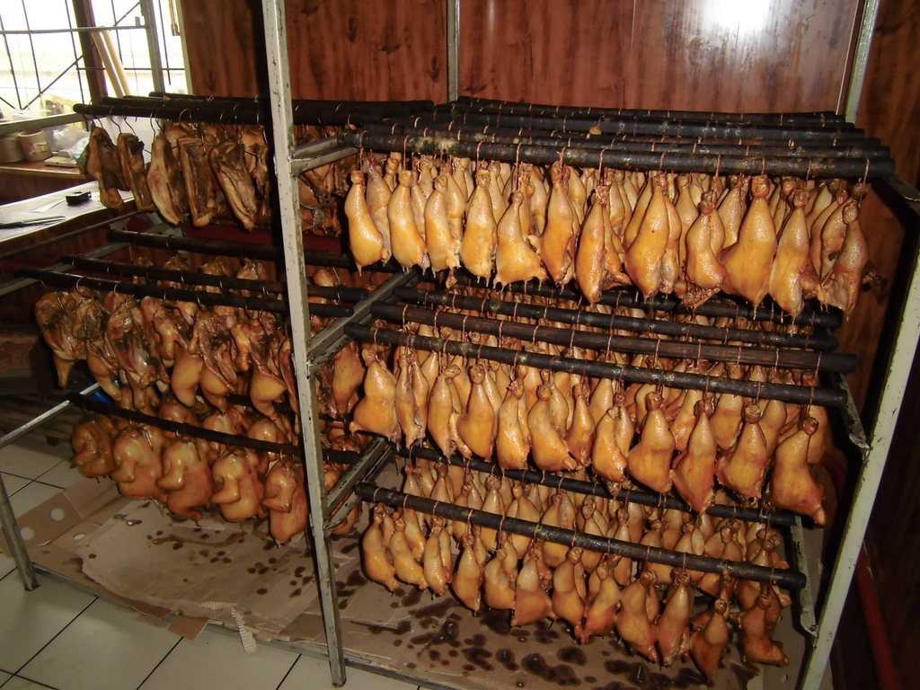 Прошедшие режим осадки колбасные изделия в обжарочных камерах обрабатываются в течение 4-6 часов дымом от горения опилок конкретной древесной породы. Температура устанавливается в диапазоне 75-80°С.
