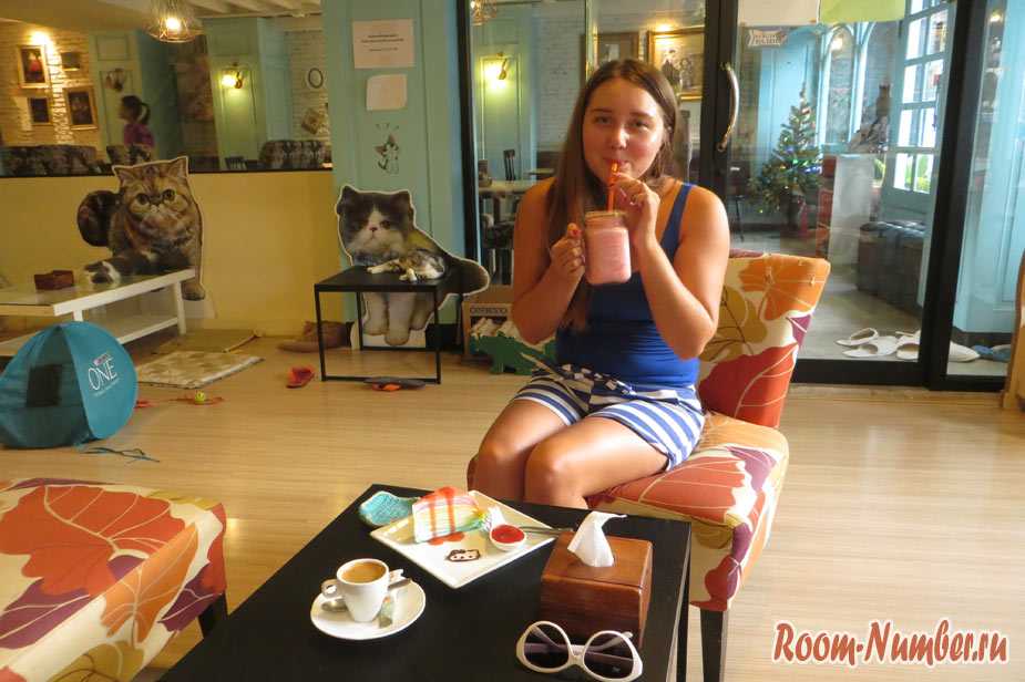 Слава взял кофе, а я заказала клубничный смузи и кусочек тортика. Все удовольствие обошлось нам в 280 бат. Эта и считается негласным сбором за вход в кафе, так как дополнительно ничего больше оплачивать не нужно. В кафе можно находиться неограниченное время.