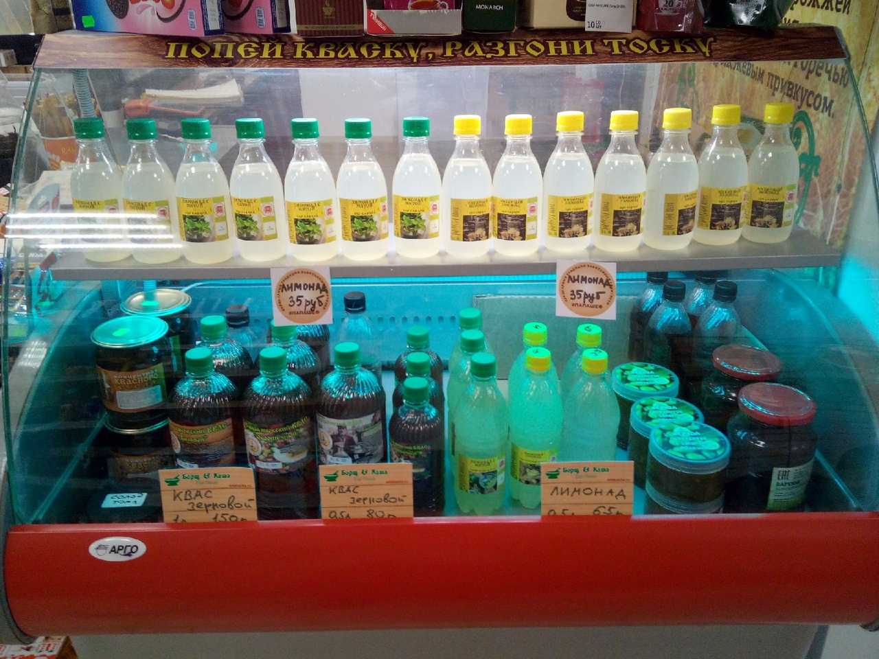 Уже разлитый по бутылкам квас в мини-маркете «Борщ и каша — еда наша»