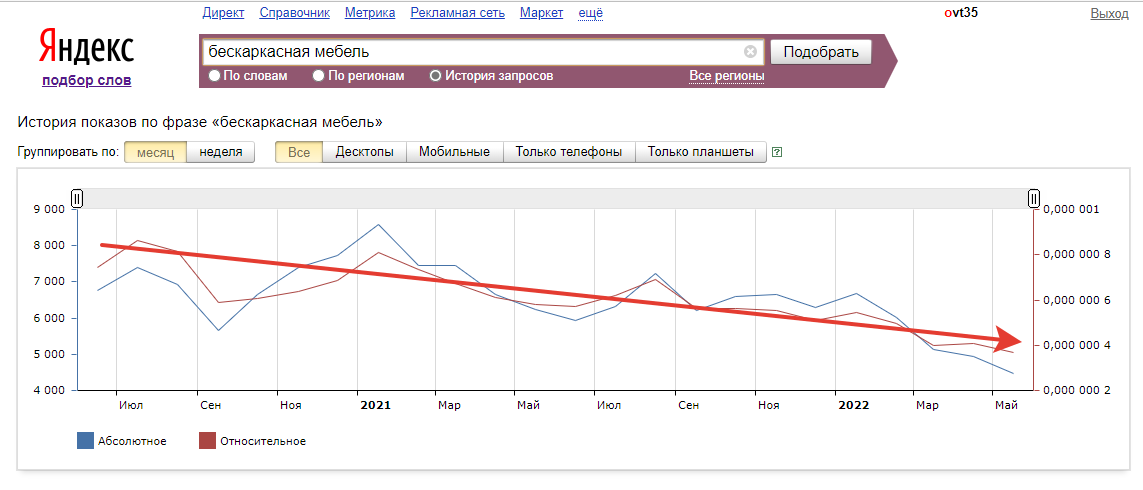 Количество запросов «бескаркасная мебель» с июля 2020 года упала почти вдвое