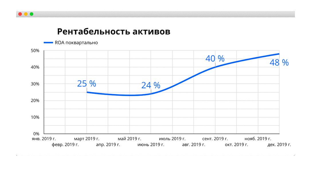 Нормально, если рентабельность активов падает после покупки нового оборудования или расширения бизнеса. Но если она не начинает расти в течение трех месяцев после этого, значит, новые активы не приносят прибыли.