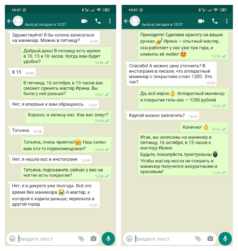 Чтобы использовать мессенджеры эффективно, разработайте скрипты для персонала. Готовые шаблоны для переписки упростят работу администратора, а у вашего салона появится единый стиль общения с клиентами. Вот несколько важных моментов в переписке, которые лучше продумать заранее.