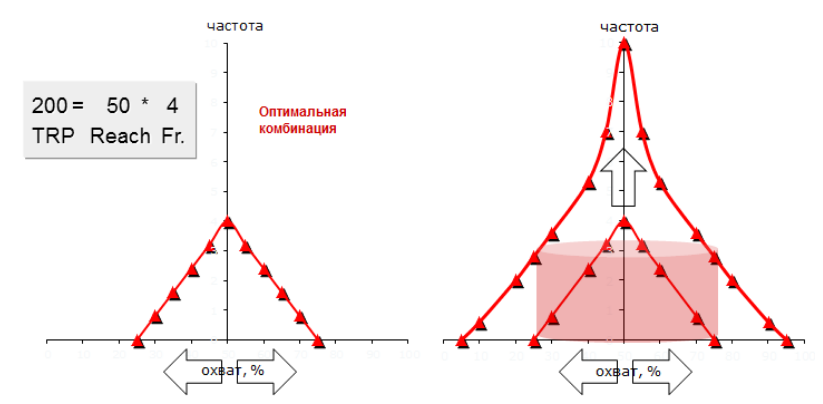 И в первом и во втором случае реклама работает неэффективно. Необходимо заботиться о том, чтобы охват и частота росли сбалансировано.