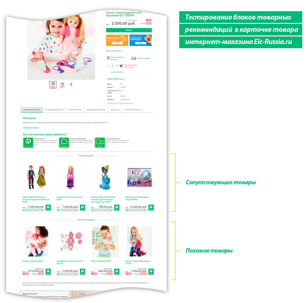 Когда пользователь находится в карточке товара, он уже гораздо ближе к совершению покупки, чем при посещении других страниц сайта, поэтому важно, чтобы рекомендации не отвлекали его внимание, а мягко дополняли процесс выбора или показывали другие варианты похожих товаров, если просматриваемый товар по каким-то причинам не подходит. Поэтому здесь работают следующие варианты рекомендаций: