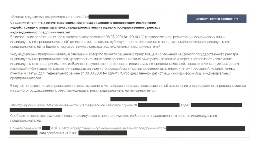 - Если прошел 1 месяц с даты поступления постановления о закрытии, у Предпринимателя есть 30-45 дней (в зависимости от региона) для того, чтобы подать возражение в ФНС и восстановить свой статус ИП. Процент восстановления ИП в таких случаях достаточно высок, для этого советуем обратиться к юристу.