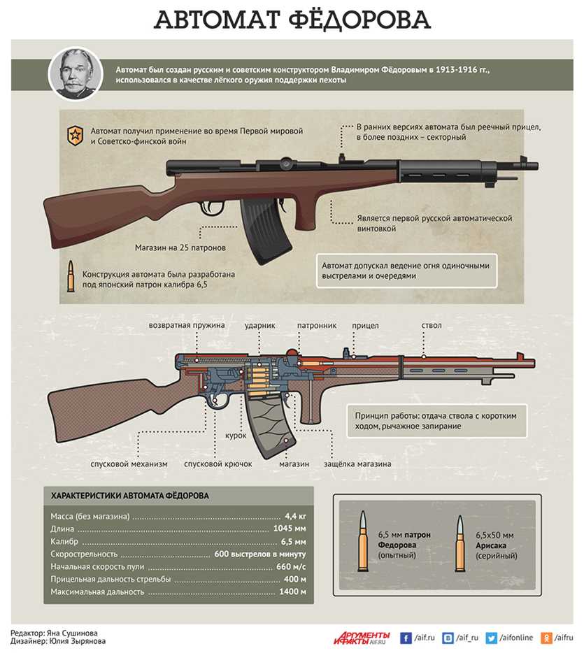 С 1913 года изобретатель Владимир Григорьевич Федоров приступает к работам, заключающимся в испытаниях автоматической винтовки (ведущей стрельбу очередями) под патрон калибра 6,5 миллиметра, которая являлась плодом его разработки. Уже спустя три года такими винтовками уже вооружают солдат 189-го Измаильского полка. Но серийный выпуск автоматов удалось развернуть лишь после окончания революции. На вооружении отечественной армии оружие конструктора находилось вплоть до 1928 года. Но, согласно некоторым данным, в период Зимней войны с Финляндией войсками все же использовались некоторые экземпляры автомата Федорова.