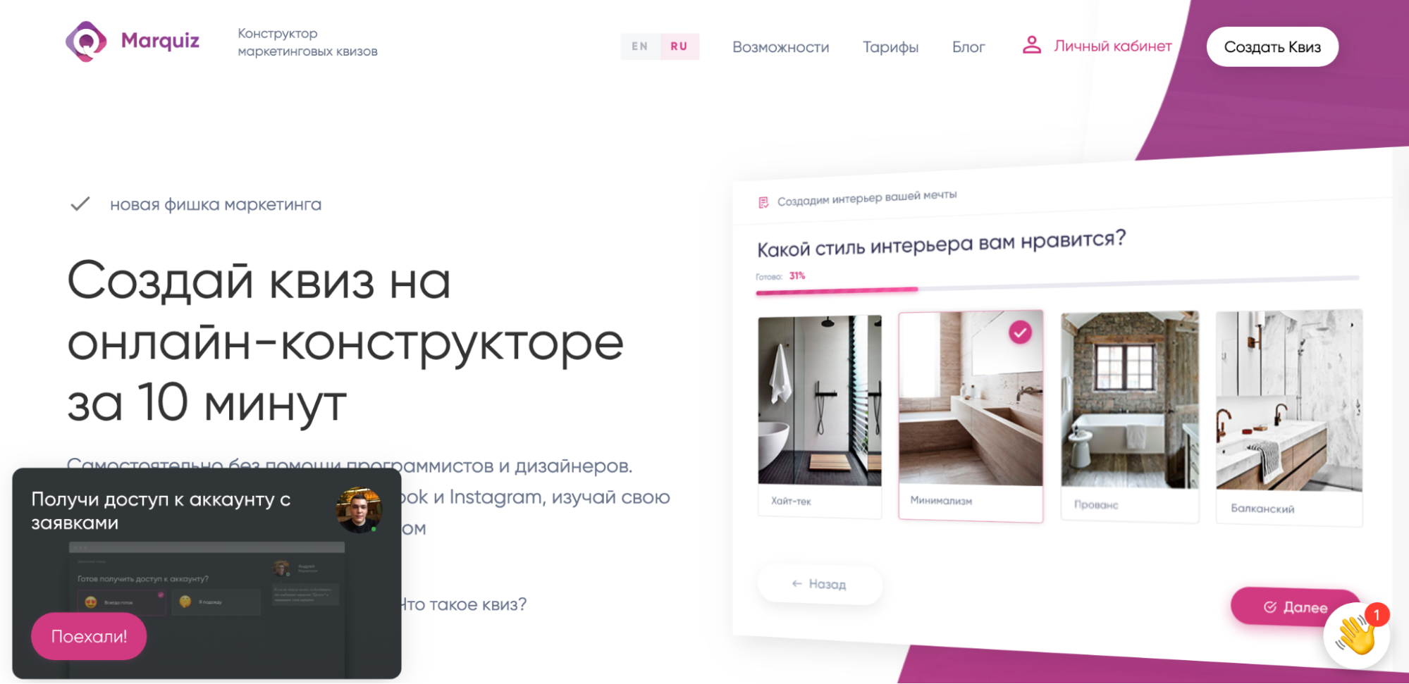 Marquiz — конструктор квизов с довольно гибкими возможностями; тестовый период до 14 дней.