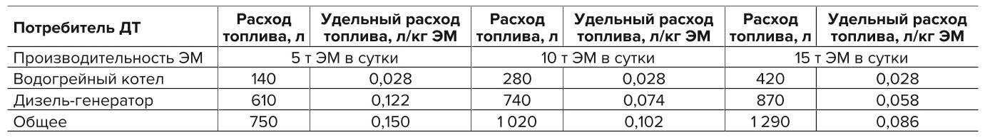 В табл. 4 представлены значения нагрузки и расходов потребителей ДТ. Расчет расхода ДТ на работу котла осуществляется по формуле (1). Исходя из того, что все потребление котла идет на растворение ГРО, расчет ведется по времени приготовления окислителя. Увеличивая производительность ЭМ, расход ДТ увеличивается пропорционально циклам растворения. За один цикл работы возможно получить 5 т ЭМ в сутки, время работы согласно табл. 2–6 ч. Для приготовления 10 и 15 т ЭМ необходимо провести 2 или 3 цикла работы соответственно. Значения удельного расхода топлива разной производительности ЭМ для водогрейного котла представлены в табл. 5.