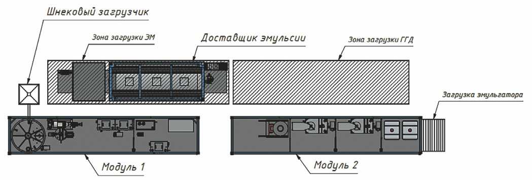 Данные операции в большинстве случаев выполняются параллельно в течение 4 ч. Процесс приготовления ГРО, ТР и ЭМ происходит в Модуле №1, который вмещает несколько зон обслуживания, а также имеет комнату с размещенными в ней жидкостным котлом и гидравлической станцией для тепло- и электрообеспечения. Для приготовления ГРО используются аммиачная селитра и вода, подача которых происходит с помощью шнекового транспортера, установленного вне модуля, и насоса воды соответственно. Основной компонент ТР в емкость приготовления поступает из Модуля №2, в котором предусмотрено отделение разогрева. Контроль качества компонентов ЭМ перед подачей в производство контролируется посредством отбора проб через пробоотборники, встроенных в емкостях приготовления. После приготовления ГРО и ТР подача компонентов на эмульгирование выполняется автоматически насосами с приводами от гидравлических моторов при помощи пропорционального гидравлического распределителя. Получение ЭМ происходит в аппарате эмульгирования при смешении ГРО и ТР в течение 1 ч, за счет чего на выходе из коллоидного диспергатора образуется мелкодисперсная эмульсия типа «вода в масле» .