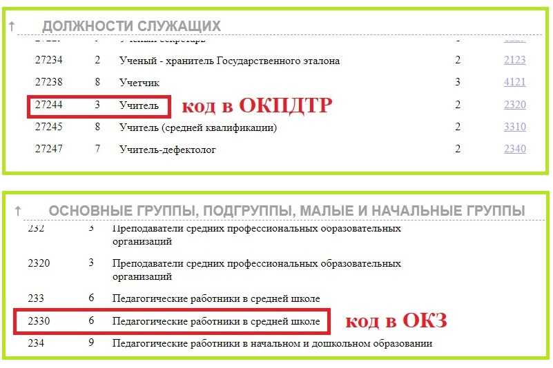 Это был пример, как найти ОКПДТР по ОКЗ, теперь попробуем сделать наоборот. По названию профессии подобрать род занятий. Возьмем профессию учителя (в ОКПДТР — 27244) и для нее найдем подходящий код в ОКЗ. Учитель в классификаторе занятий — это лицо, относящееся к группе «Педагогические работники в средней школе», а код — 2330.