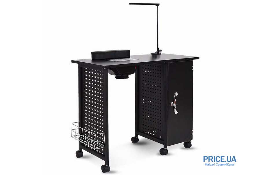 Стол. Габариты стола должны обеспечивать комфортное сидение мастера и клиента, а также расположение необходимых принадлежностей (средства дезинфекции рук, инструмент, ванночка для рук, подставка, вытяжка, аппарат для маникюра). Оптимальные размеры стола составляют: 45-55 сантиметров по ширине, 75 сантиметров по высоте и не менее 1 метра по длине. Стол для маникюра может иметь надстроенные полки и боковые ящики, а столешница может быть складной