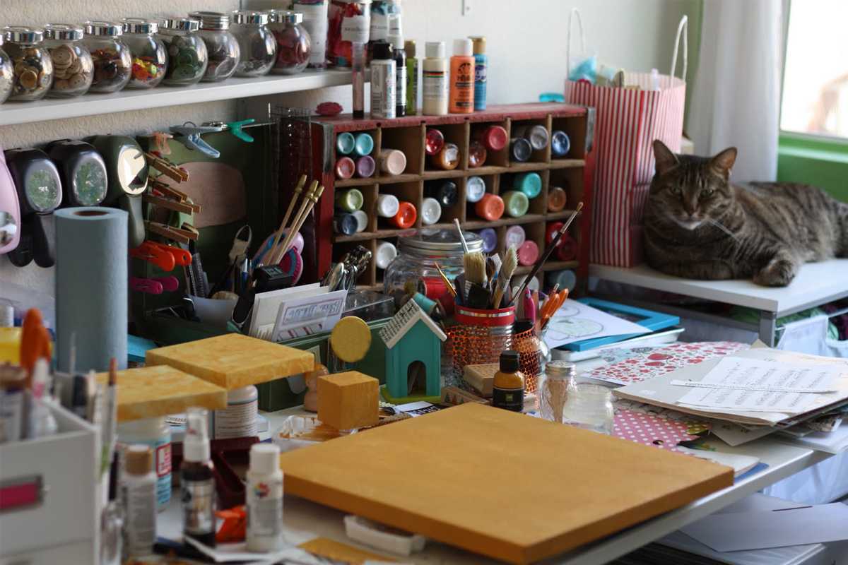 Конечно, в идеале было бы отвести под творческую мастерскую целую комнату — пусть самую маленькую в квартире, пусть вовсе на чердаке дома, но своё пространство с дверью и окошком, такое, чтоб вход «посторонним» только по приглашению, а стеллажей и ящичков под материалы не сосчитать.