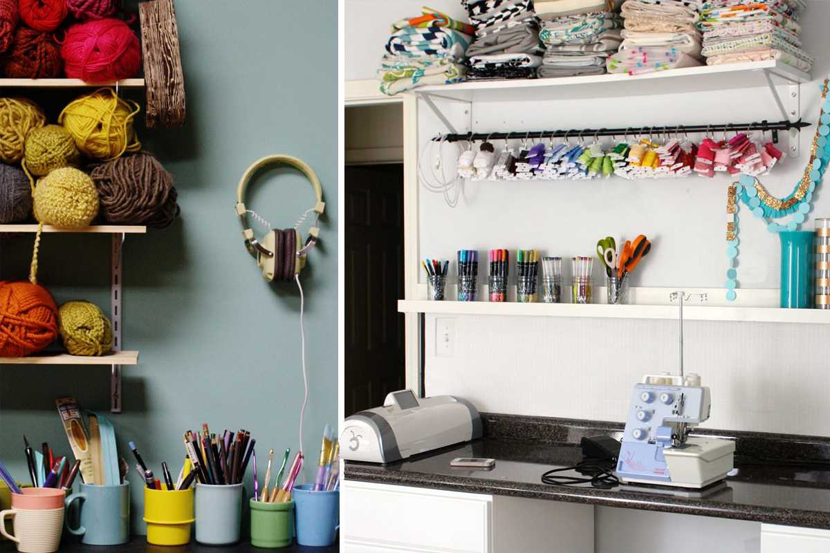 Наша цель – как можно удобнее и компактнее расположить “сырье”: катушки, ленточки, иголки, инструменты. Используйте любое свободное пространство, стены в том числе.