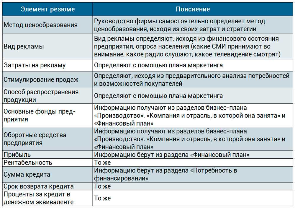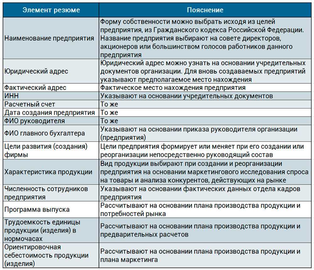 Практически каждый элемент резюме имеет прямую связь с соответствующим разделом основной части бизнес-плана. Для некоторых моментов требуется отдельное решение руководства компании-проектоустроителя (например, наименование предприятия под новый бизнес, его юридический адрес и т.д.). Далее вашему вниманию предлагается пример содержания резюме с пояснением источников представления информации.