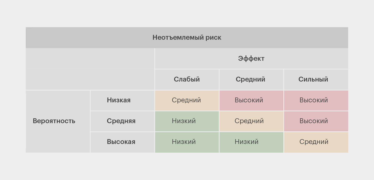 - Если вероятность низкая, а последствия дадут слабый эффект, то об этом риске не стоит беспокоиться. Просто имейте в виду, что он есть.