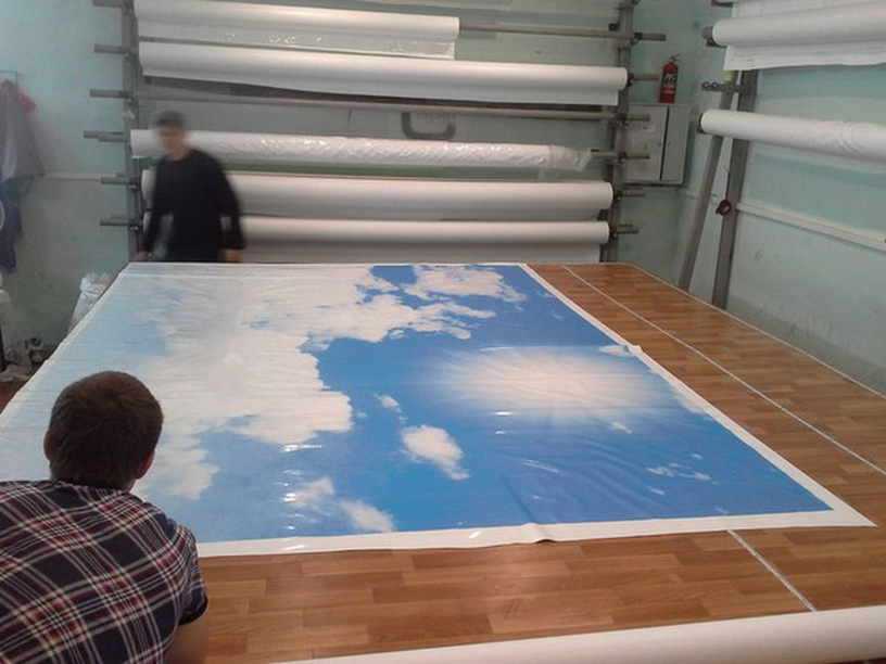 - Если клиент одобрил услугу, заказ отправляется на производство, где по замерам изготавливают полотно будущего натяжного потолка.