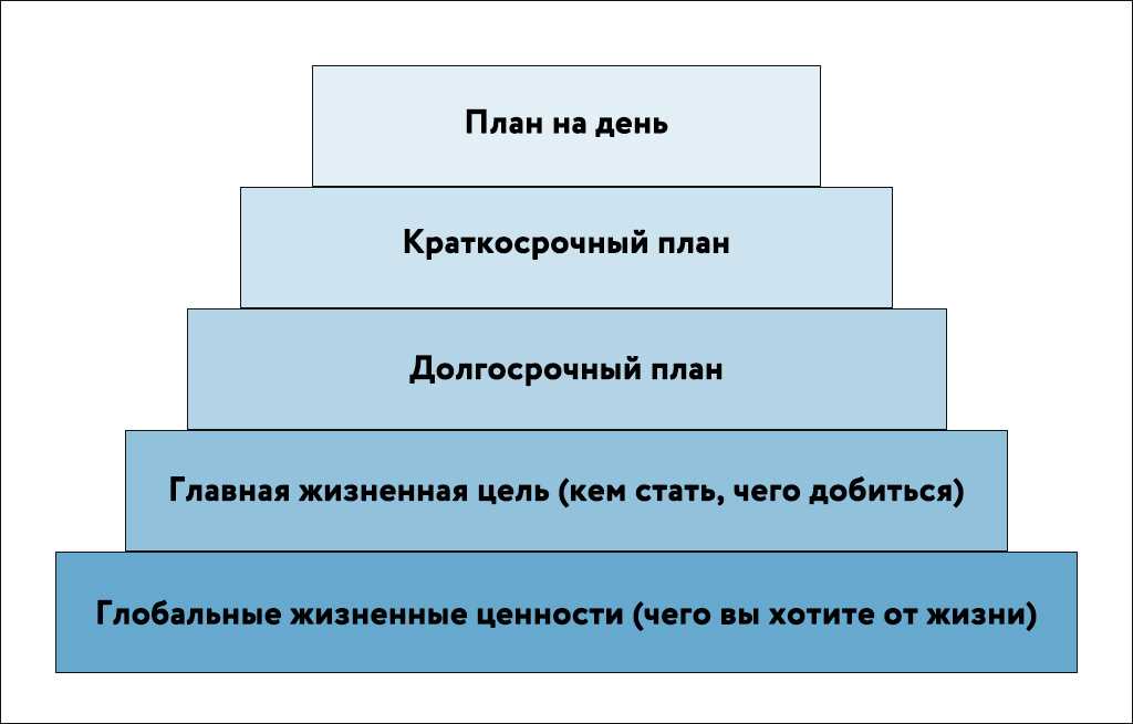 На ступень выше лежит главная жизненная цель: кем стать, чего добиться, чтобы реализовать глобальную цель.