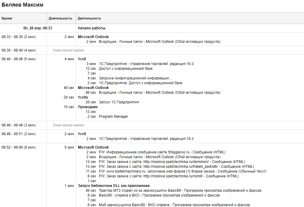 запуска нерегламентированных программ и периодов простоя в рабочем процессе. Указание приложений, которые были активны у пользователя в то или
