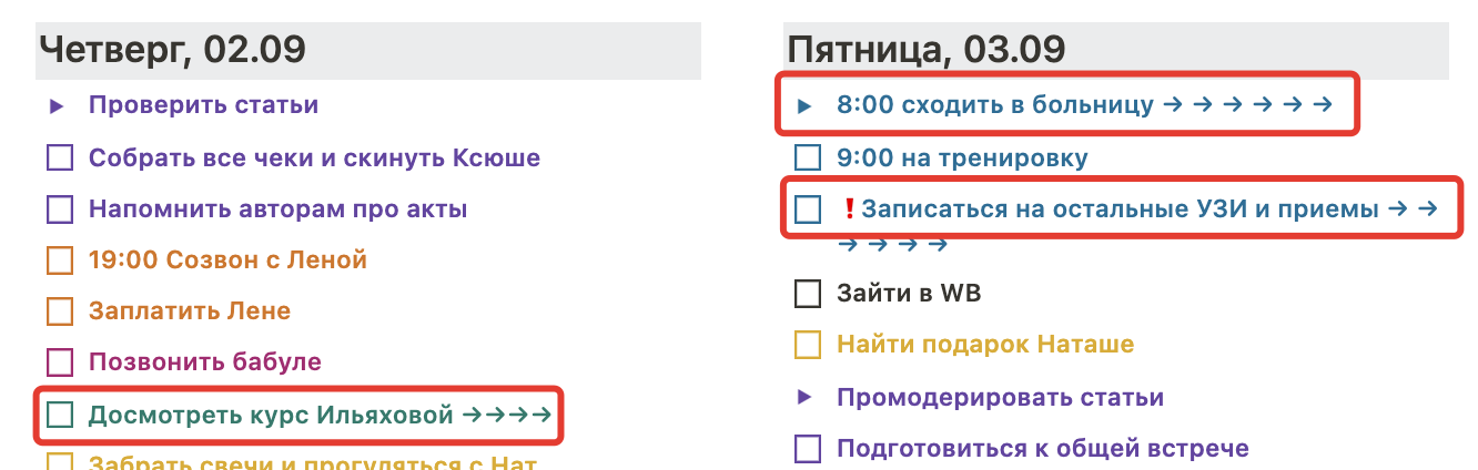 Также внутри дней могут быть большие задачи с мелкими подзадачами — их следует вести вот так: